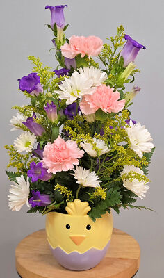 Celebrate the joy of the season with our Easter arrangements designed in adorable keepsake baby chick containers, bursting with bright, cheerful spring blooms. Choose a compact design or tall and airy.